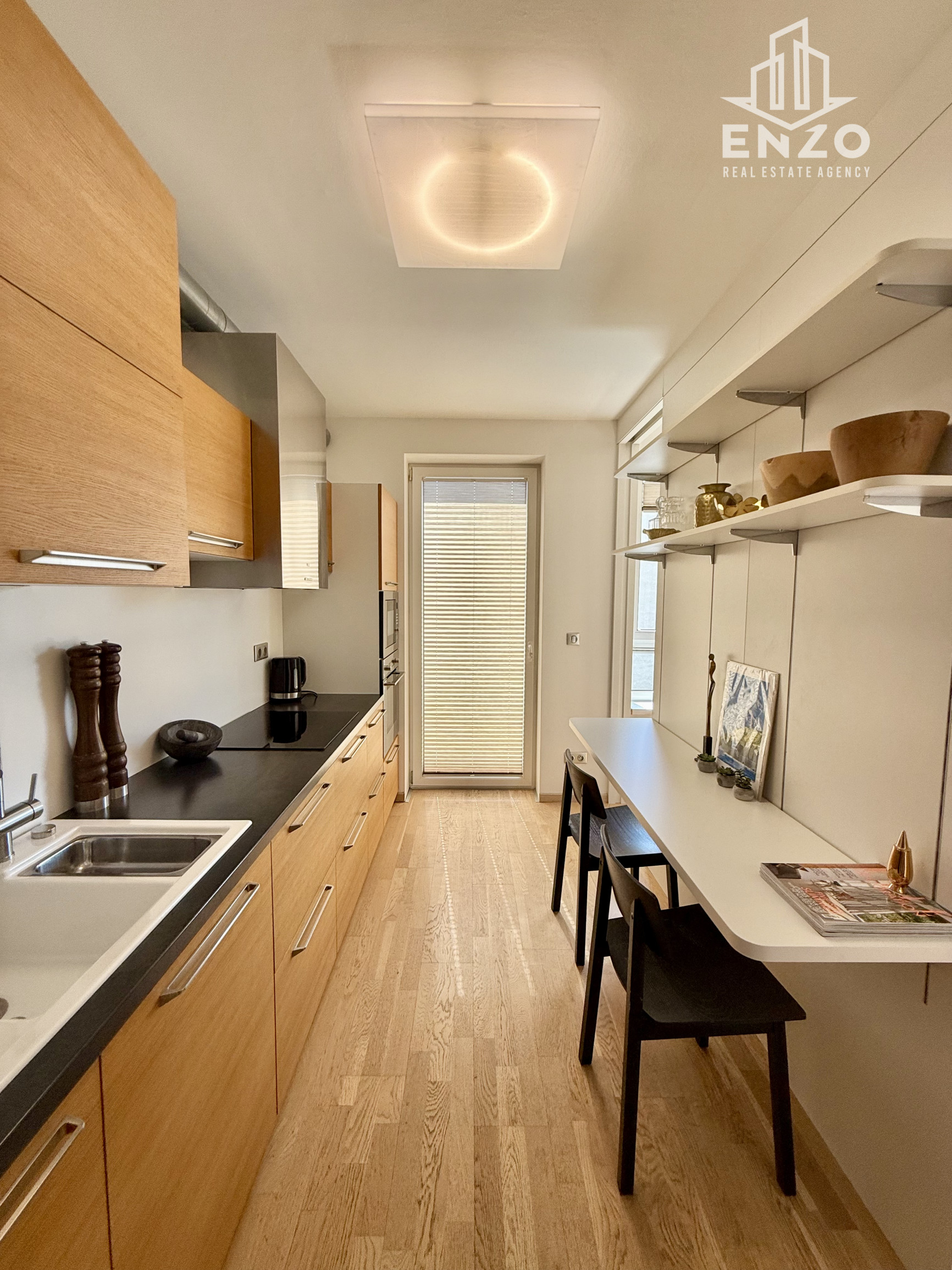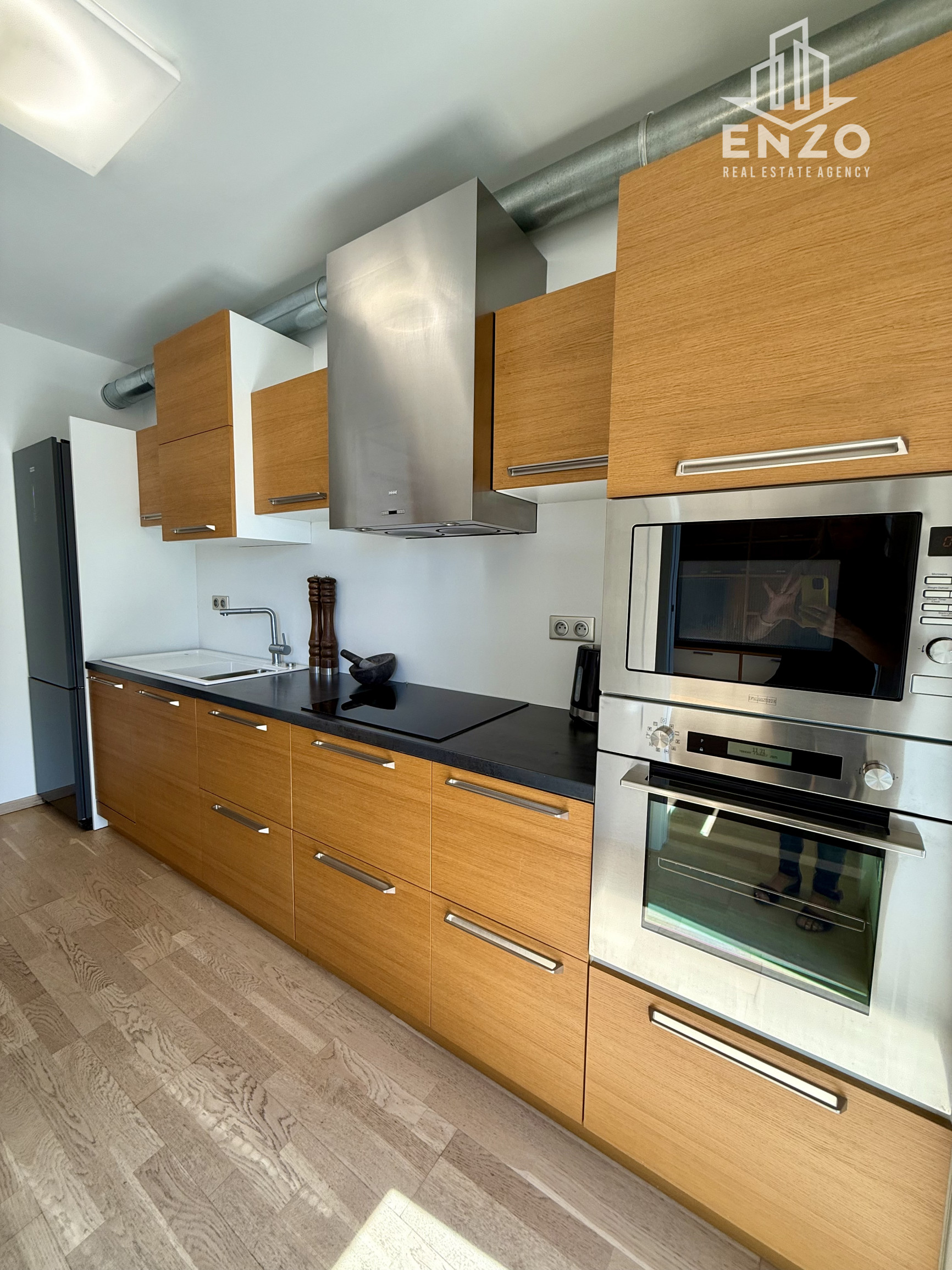 - Kuchyňa - moderná kuchynská linka so zabudovanými spotrebičmi (elektrická rúra, umývačka riadu, mikrovlnná rúra, chladnička s mrazničkou, digestor) a vyklápacím jedálenským pultom,