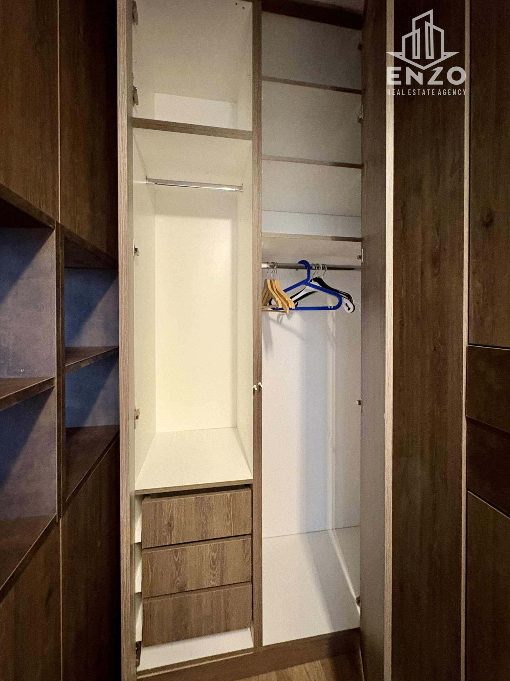 Byt je zariadený nábytkom na mieru. Skrine oddeľujú obývaciu a spaciu časť. Na spanie je jednolôžko. Na odkladanie slúžia vysoké skrine na šaty a rôzne skrinky a zásuvky. Kuchyňa je vybavená všetkým, čo potrebujete. Je tu teplovzdušná rúra, mikrovlna rúra, umývačka riadu, chladnička s mrazničkou, digestor. Na stolovanie slúži vyšší barový stolík so stoličkami. Z izby vychádzate na zaklenný balkón, odkiaľ sú pekné výhľady, nakoľko ste na 6.poschodí. Byt je orientovaný na východ. Okná sú vybavené žalúziami aj sieťkami. V kúpelni je vaňa, umývadlo so skrinkou, zrkadlová skrinka a odkladacia skrinka. WC je samostatné s malým umývadlom.