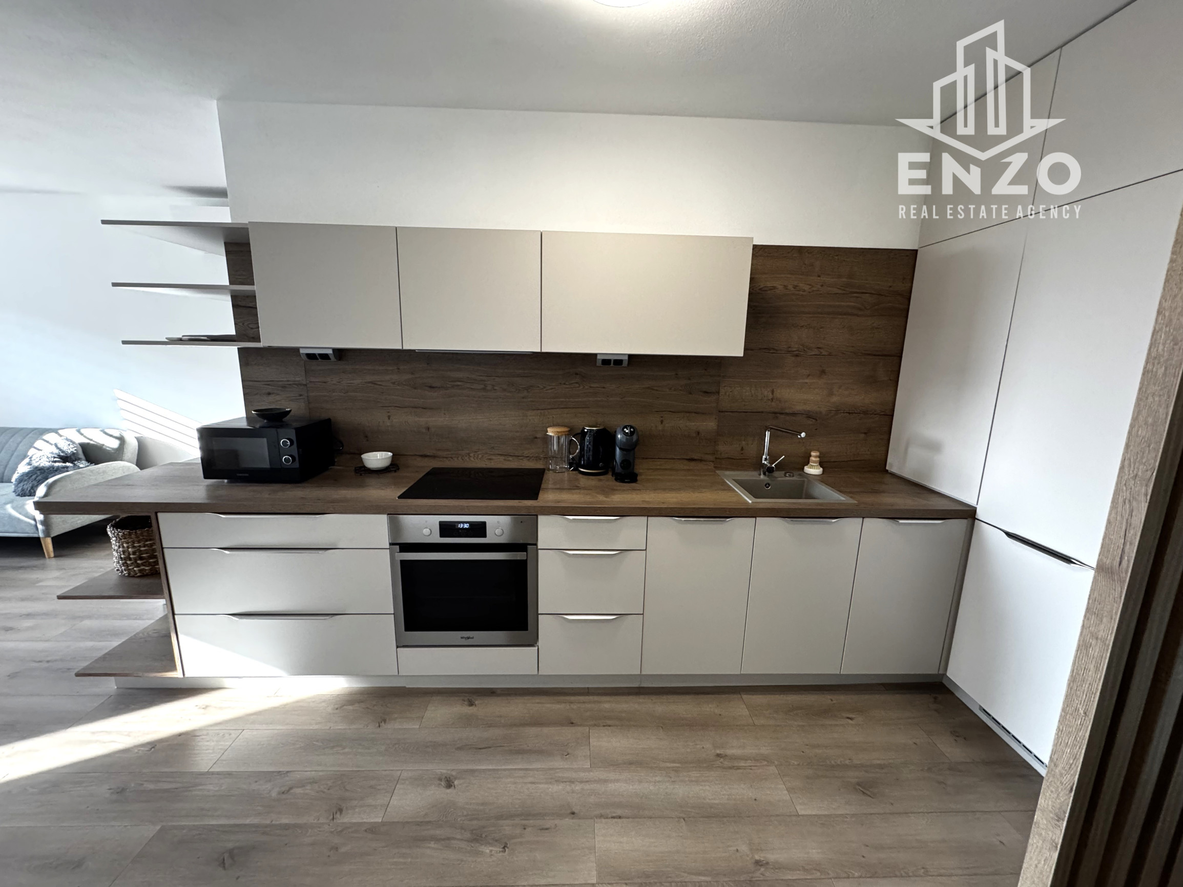 ZARIADENIE: Byt je kompletne zariadený nábytkom na mieru - k dispozícii sú naozaj veľkorysé úložné priestory. Plne zariadená kuchyňa (umývačka riadu, veľká chladnička s mrazničkou, indukčná varná doska, rúra, mikrovlnná rúra, kávovar, riad a pod.), obývacia izba s dizajnovým gaučom a TV, manželská posteľ a veľa úložných priestrov vo vstavaných skriniach v spálni aj na chodbe. Ďalej v byte nájdete klimatizáciu, vonkajšie žalúzie, veľkú práčku, na oknách sú sieťky proti hmyzu.