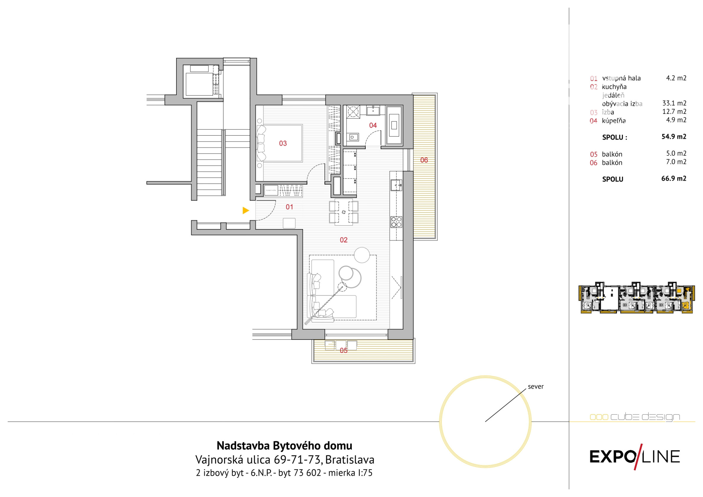 Byt sa nachádza v nadstavbe z roku 2021 a ponúka moderné a štýlové prevedenie. Celková plocha bytu je 65,51 m² (interiér 54,7 m², balkóny 4,36 m² a 6,45 m²). Nachádza sa na 5. poschodí zo 7. Vďaka orientácii na viacero svetových strán a veľkým preskleným plochám poskytuje množstvo prirodzeného svetla počas celého dňa.