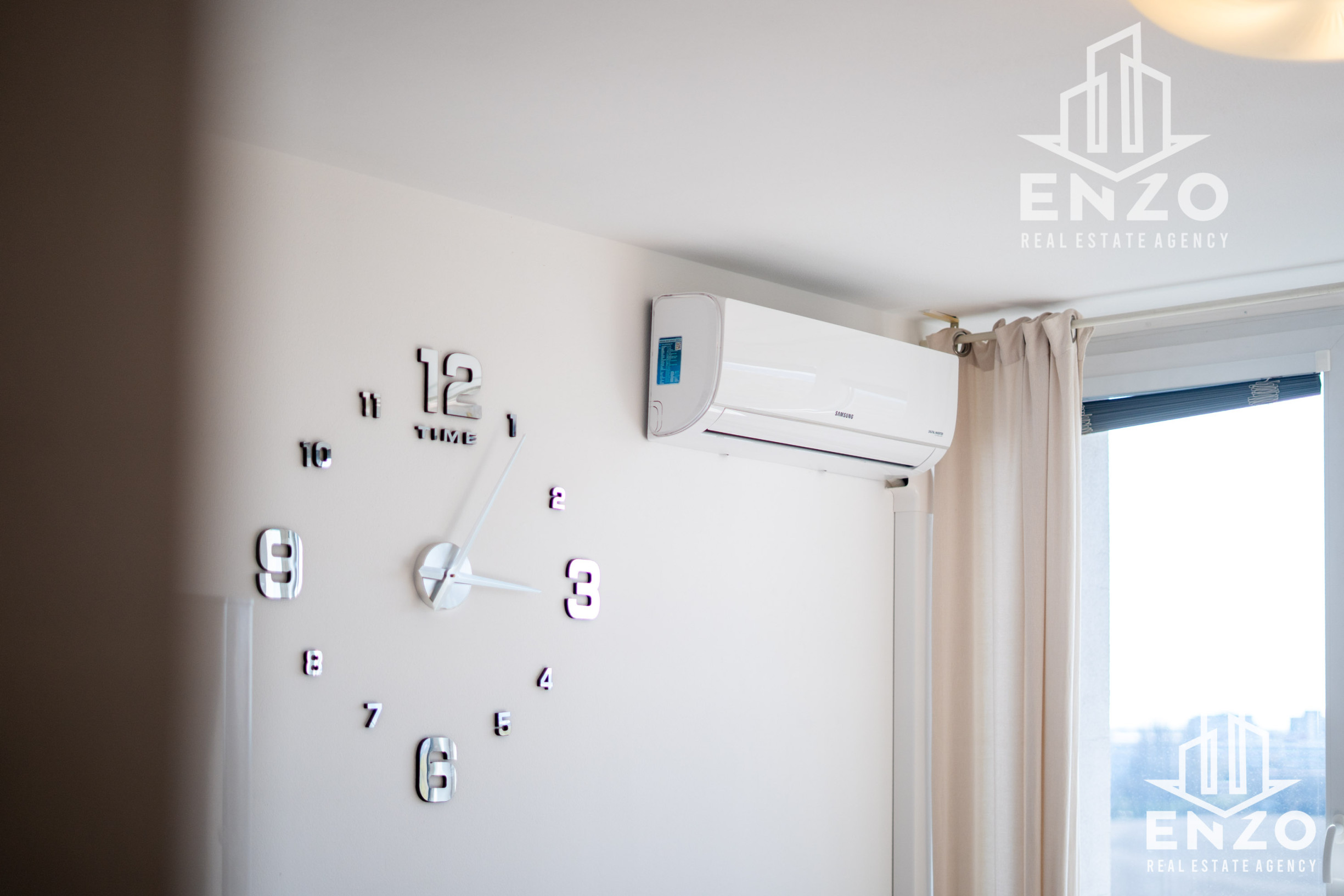 Interiér bytu je zariadený účelne a vkusne, s dôrazom na maximálne využitie priestoru a útulnosť. Celý priestor pôsobí sviežo vďaka čerstvo vymaľovaným stenám a moderným materiálom, ktoré zabezpečujú nenáročnú údržbu. Na mieru vyrobené vstavané skrine v predsieni a spálni poskytujú veľkorysý úložný priestor, zatiaľ čo kuchyňa je plne vybavená všetkými potrebnými spotrebičmi. Vysoký komfort bývania, najmä počas letných mesiacov, zabezpečuje nainštalovaná klimatizácia, ktorá v kombinácii so západnou orientáciou bytu vytvára ideálnu vnútornú klímu.