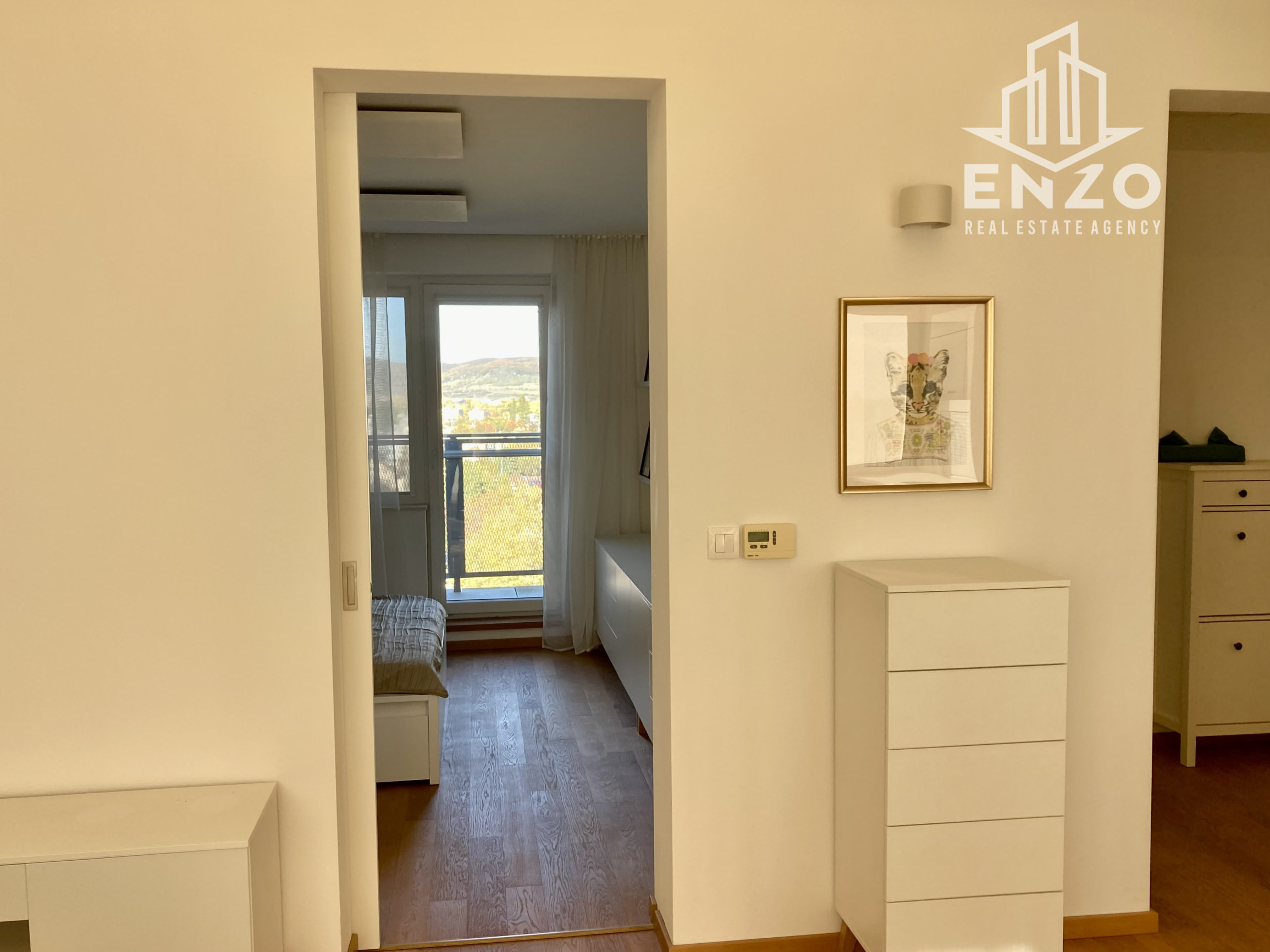 Vstupný priestor s obývačkou a kuchyňou má otvorenú dispozíciu. Je tu vstavaná skriňa na odloženie kabátov, Kuchyňa s rúrou a indukciou, chladnička s mrazničkou, digestor. Obývačka so sedačkou a komodami. Z obývačky je východ na menšiu terasu. Spálňa je vybavená vstavanými skriňami a dvojposteľou. Odtiaľ je východ na väčšiu terasu. Menšia izba slúži ako pracovňa. Kúpeľňa je s vaňou , sprchou, umývadlom a práčkou. Tiež je tu vlastný kotol na teplú vodu. Byt má samostatné WC.