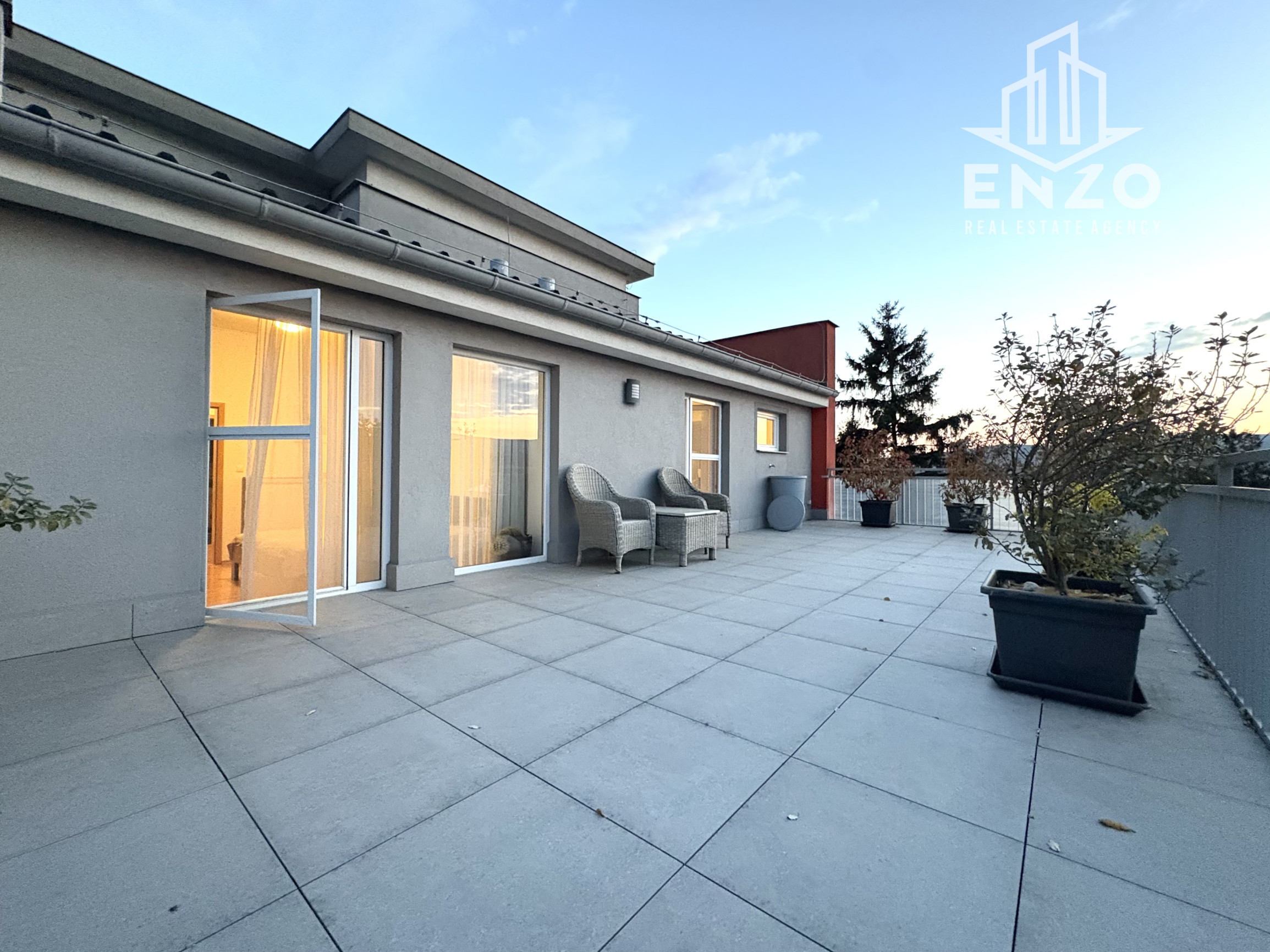 Byt o rozlohe 81 m2, k tomu terasa 46m2, loggia 6m2 a samostatná garáž vo dvore.