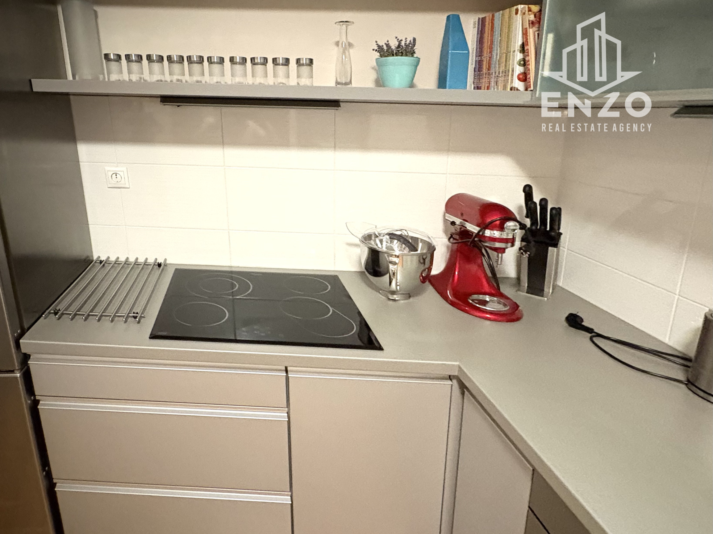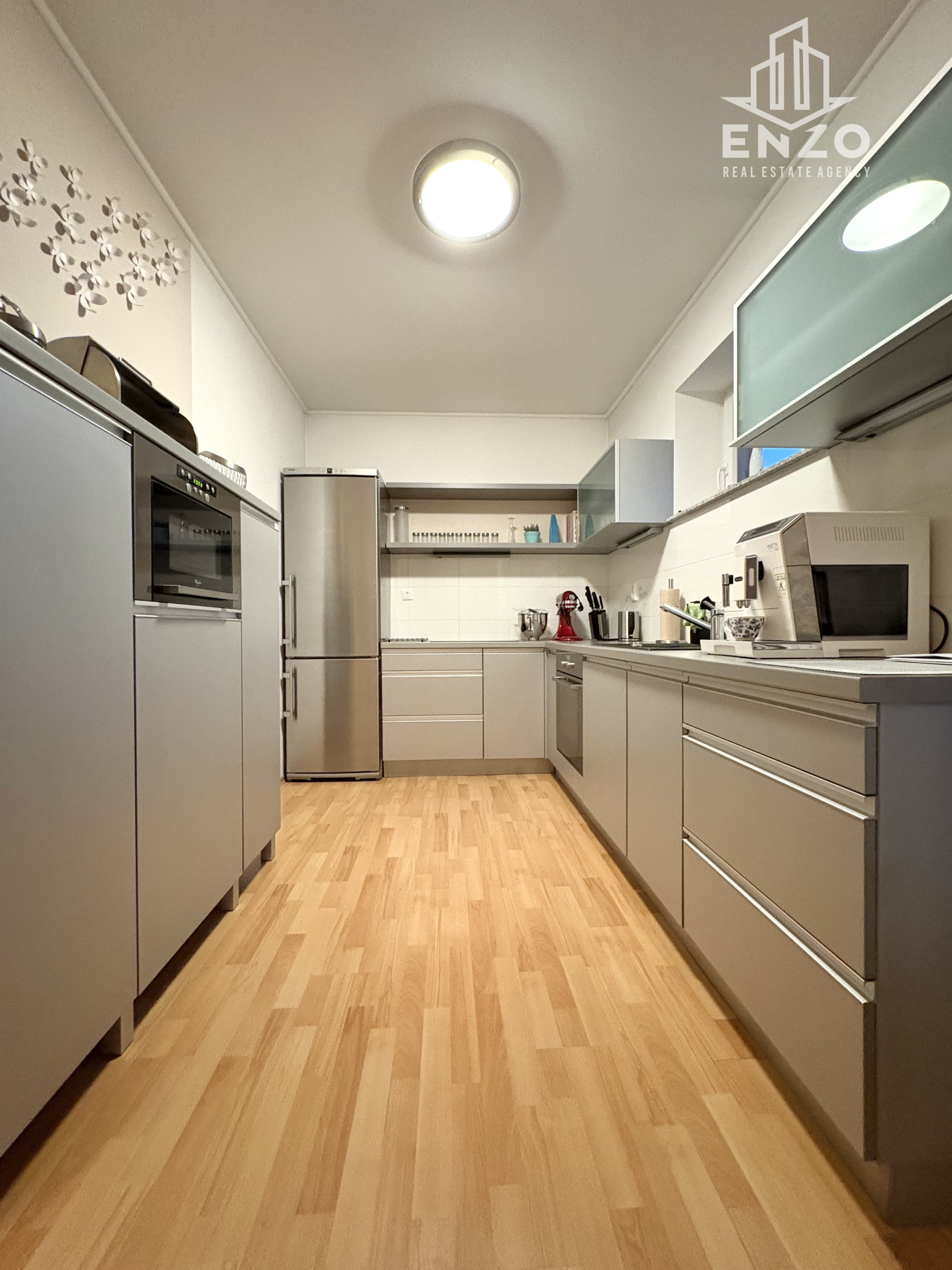Kuchyňa so špajzou je komplet zariadená s dostatkom úložného priestoru. Kuchynská linka v tvare L je vybavená chladničkou s mrazničkou, umývačkou riadu, indukčnou varnou doskou, kávovarom. Ďalšia skrinková zostava je so zabudovanou mikrovlnkou.